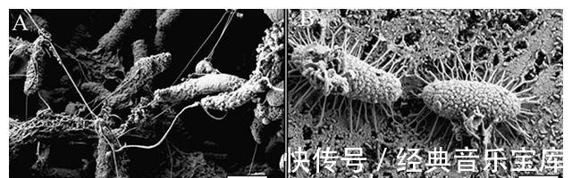 △扫描电镜下观察到的钢材上附着的微生物(图片来源:参考文献3)